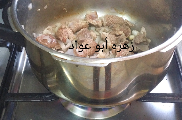 حطي اللحمه في الطنجرة افرمي البصل وحطي عليها ملعقة من الزيت وضلي حركيهم مع بعض لحد ما تنشف ميتها حطي عيدان القرفة والهيل ورق الغار وضيفي الماء وخليها تستوي مع مراعاة وجود كمية من الشوربة مناسبه لكميه البطاطس الي حتحطيها عليها