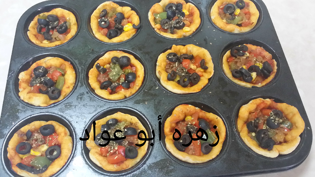 ادهني قوالب الكب كيك بشويه زيت وزعي قطع العجينه على القوالب وحطي عليها الحشوة ورشي الاوريجانو وحطي الزيتون