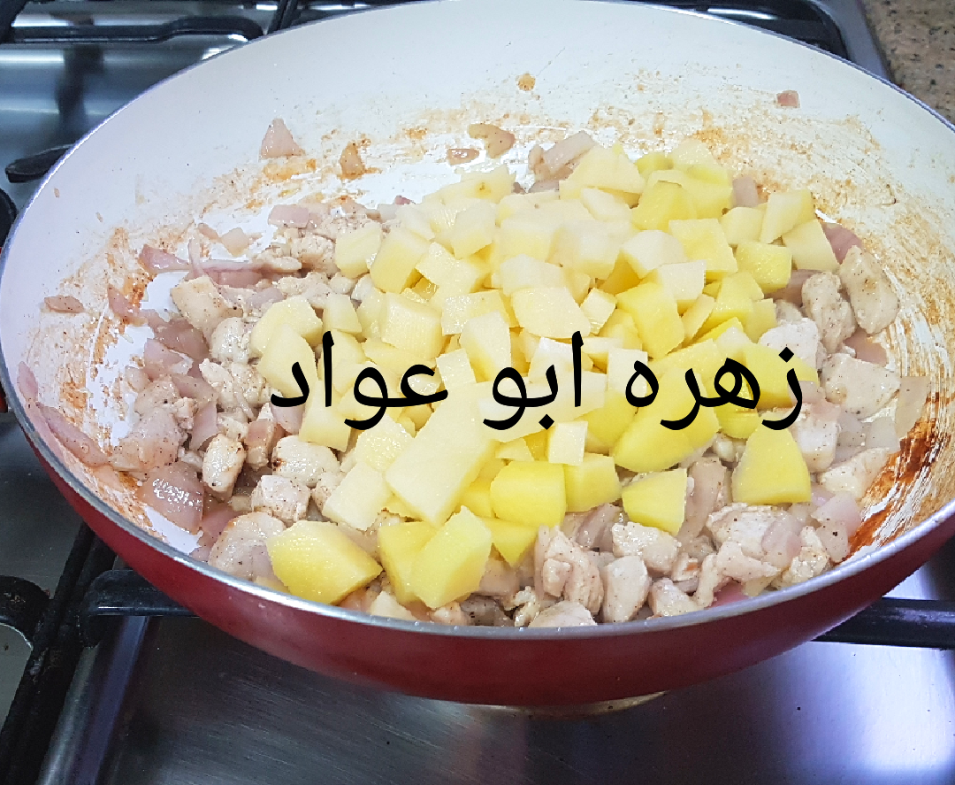 في مقلاه حطي الدجاج وحطيها على النار ضلي حركي بالدجاج حت٩تنشف مينه ضيفي ملعفه زيت وحطي البصل وقلبيهم مع بعض ضيفي الملح والبهارات ضيفي البطاطا وقلبيهم مع بعض ضيفي. البازيلا والفلفل وحركيهم مع بعد ضيفي شويه من الماء وخليهم يستوا