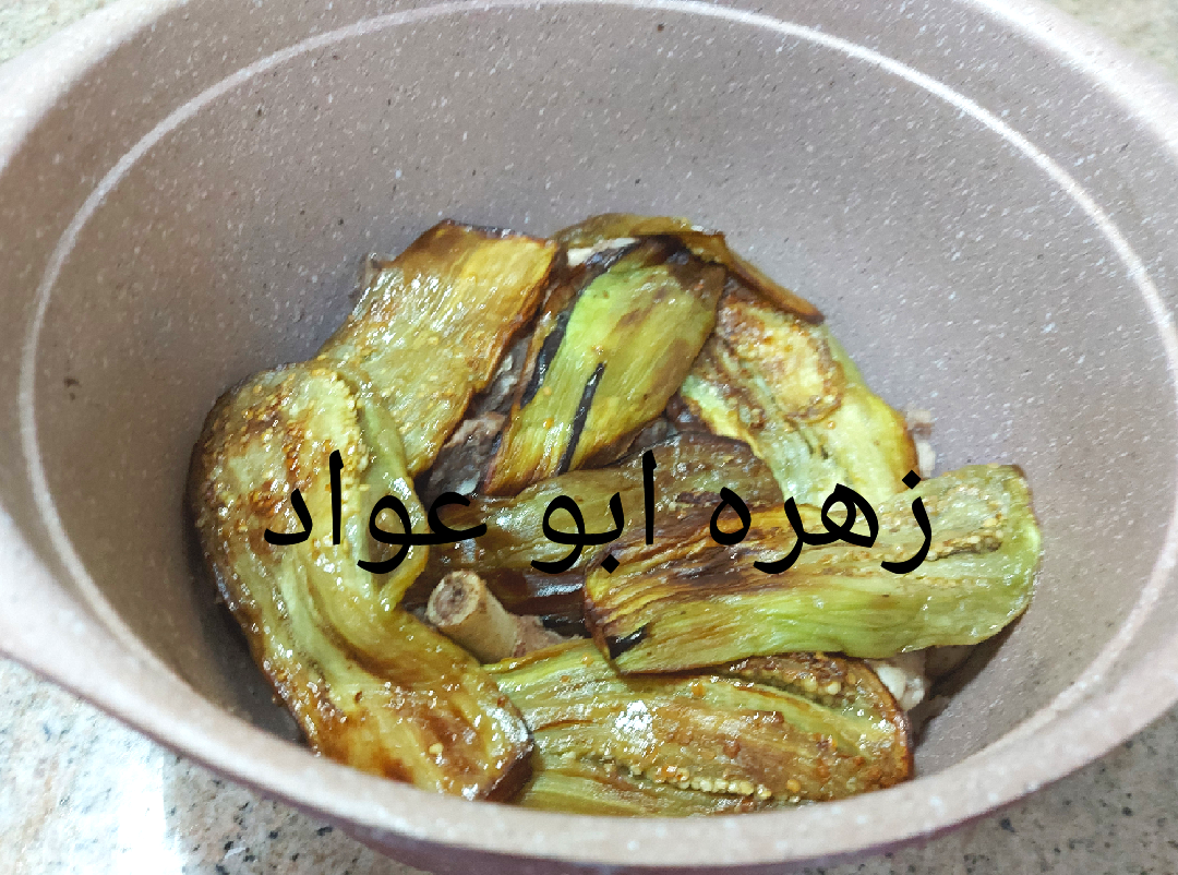 حطي الدجاج واللحمه وحطي والبيذنجان. وحطي الأرز وشوربه الدجاج الحاره كل كوب أرز يحتاج كوب ونصف شوربة أو خلي الشوربة أعلى من سطح الأرز بحوالي 3 سم ثم تغطى الطنجرة وتوضع على نار عاليةلحد ما تنشف ميتها وطي النار واتركيها على نار هادئة لحد ما تستوي وتنشف ميتها