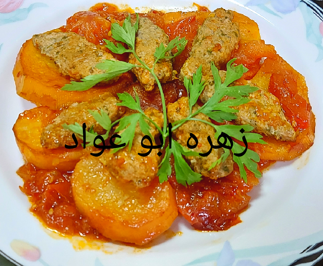 نصف أصابع اللحم على كامل صينية الموجودة فيها الطماطم و البطاطا ونضع عليها كوب ماء مع ملعقه صلصه ونضعها في الفرن حتى تستوي، نحمرها قليلاً من وجهها ونقدمها الى جانب ارز ابيض.